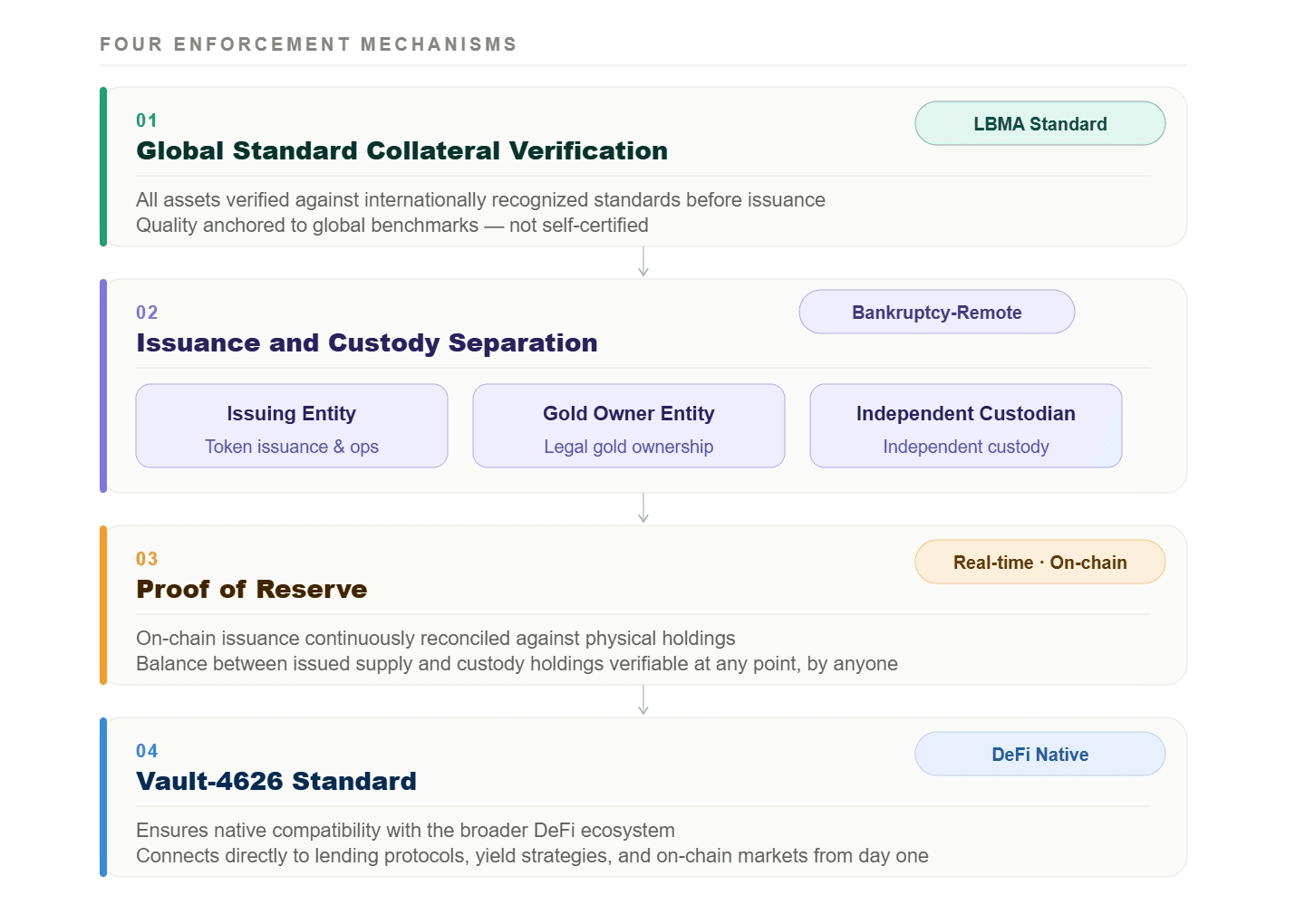 All assets are verified against internationally recognized collateral standards before issuance. As an example, Ontorium's first flagship asset, OXAU, follows the London Bullion Market Association (LBMA) standard