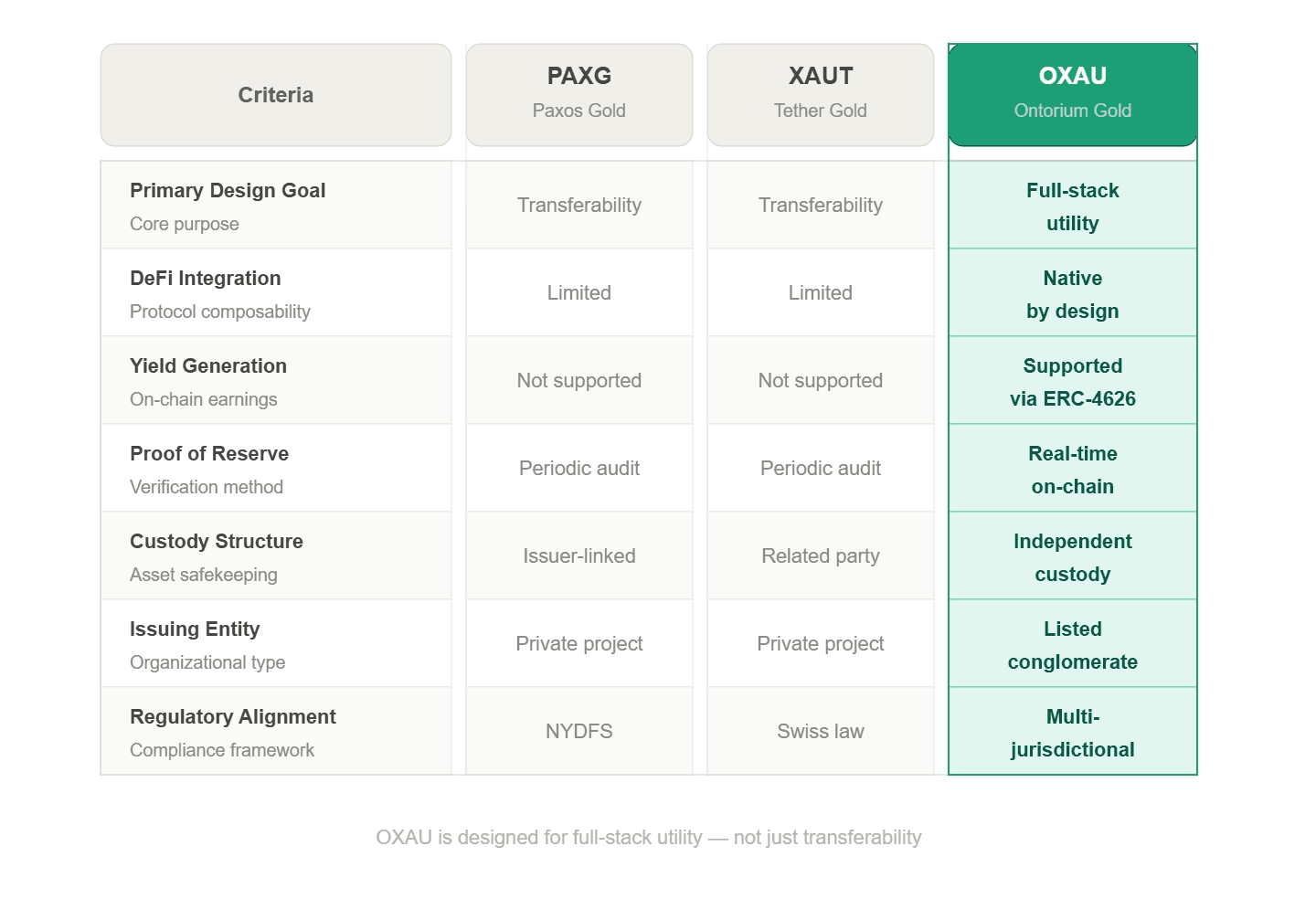 The comparison above reflects where the market stands today. What it does not capture is where the Ontorium Asset Layer is going. OXAU is where the Ontorium Asset Layer begins. It is not where it ends. The Asset Layer is designed to support programmability and expansion from the outset. While OXAU is the flagship implementation today, the Asset Layer is built to accommodate additional real assets over time. New assets can be introduced into the same structural framework so long as they satisfy the requirements of ownership clarity, backing integrity, reserve transparency, redemption logic, and onchain usability. Real estate, private credit, commodities, and beyond. In this sense, the Asset Layer is both the trust layer and the expansion layer of the Ontorium Stack. If RWA 1.0 put gold on a blockchain, RWA 2.0 puts gold to work. OXAU is where that starts.