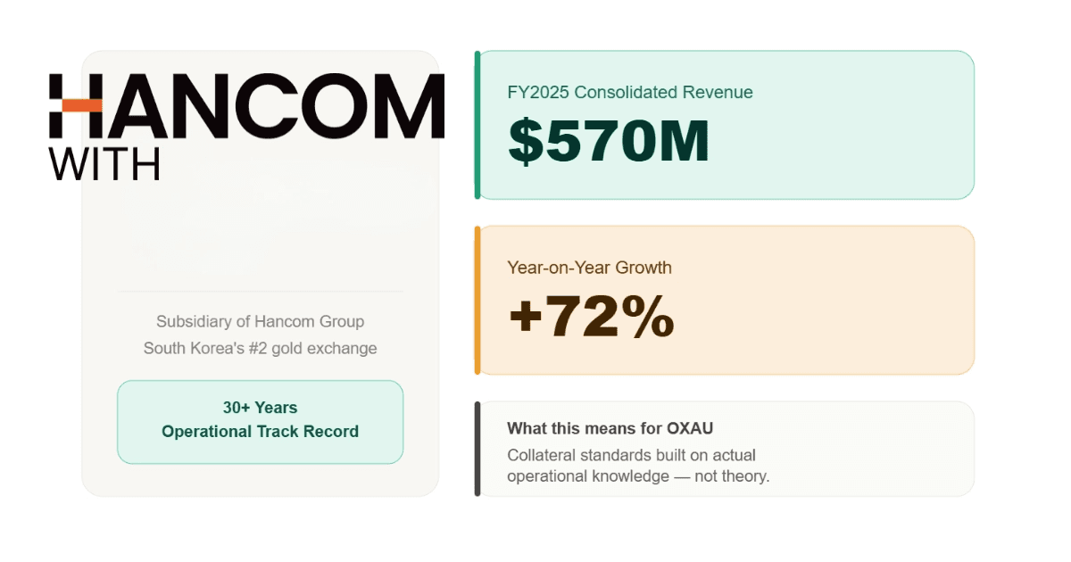 The structural framework above does not exist in isolation. It is backed by an organization with the operational depth to make it credible at every level. Ontorium's first asset is gold. That decision was not driven by market trends. It was driven by an operational foundation that already exists. Hancom Gold Exchange, a subsidiary of Hancom Group, is South Korea's second largest gold exchange. In 2025, it recorded consolidated revenue of KRW 771.2 billion ($570M), representing 72% year-on-year growth. That is not a projection. It is a verified track record of physical gold acquisition, custody, and distribution at institutional scale. The expertise built through years of operating in physical gold markets is directly embedded in the design of OXAU. The collateral standards, the custody protocols, the redemption infrastructure, each reflects operational knowledge that comes from actually running a gold business, not from theorizing about one. An organization that understands gold at that level is a fundamentally different issuer than a private project standing up a token. That difference is what OXAU is built on.