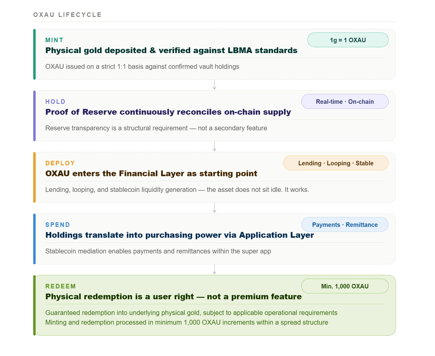 Physical redemption is a user right, not a premium feature. OXAU guarantees redemption into underlying physical gold subject to applicable operational requirements, with minting and redemption operating within a spread structure relative to the reference price.